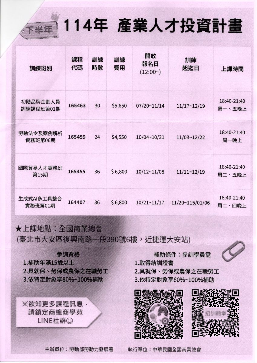 轉知~「114年產業人才投資計畫」下半年課程招生簡章,名額有限,敬請會員踴躍報名。