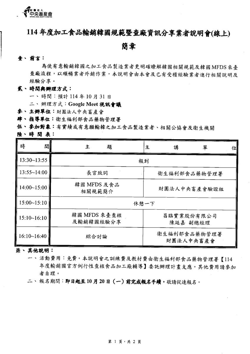 轉知財團法人中央畜產會委辦「114年度加工食品輸銷韓國規範暨查廠資訊分享業者說明會(線上)」,敬邀參加。