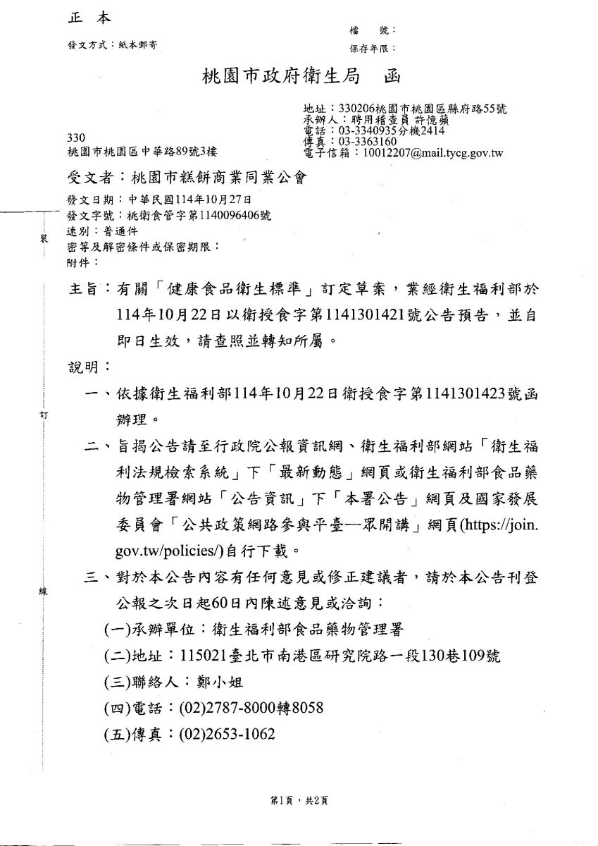 有關「健康食品衛生標準」訂定草案,業經衛生福利部於114年10月22日公告預告,請查照。