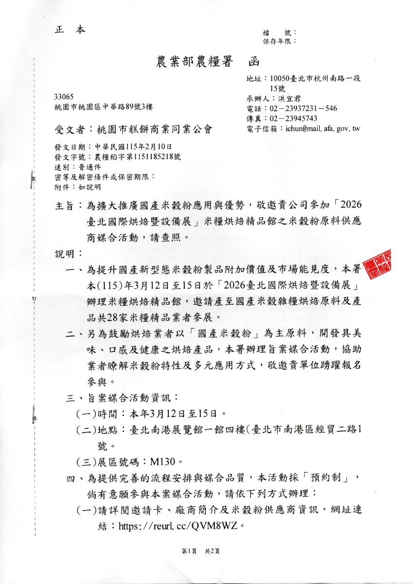 農糧署敬邀參加「2026臺北國際烘焙暨設備展」米糧烘焙精品館之米穀粉原料供應商媒合活動。