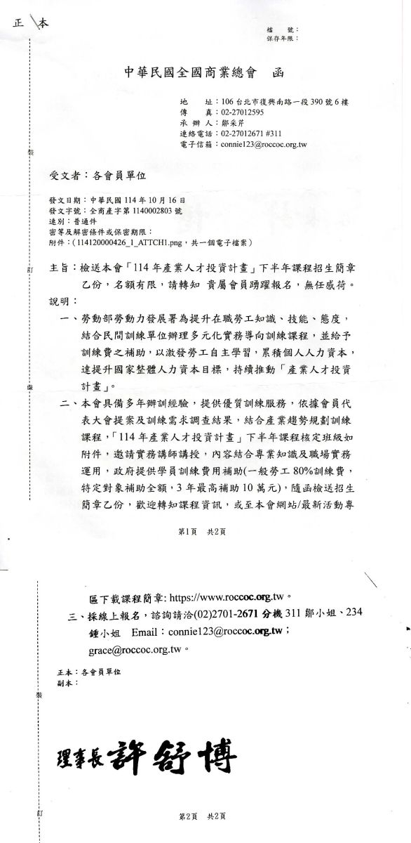 轉知~「114年產業人才投資計畫」下半年課程招生簡章,名額有限,敬請會員踴躍報名。