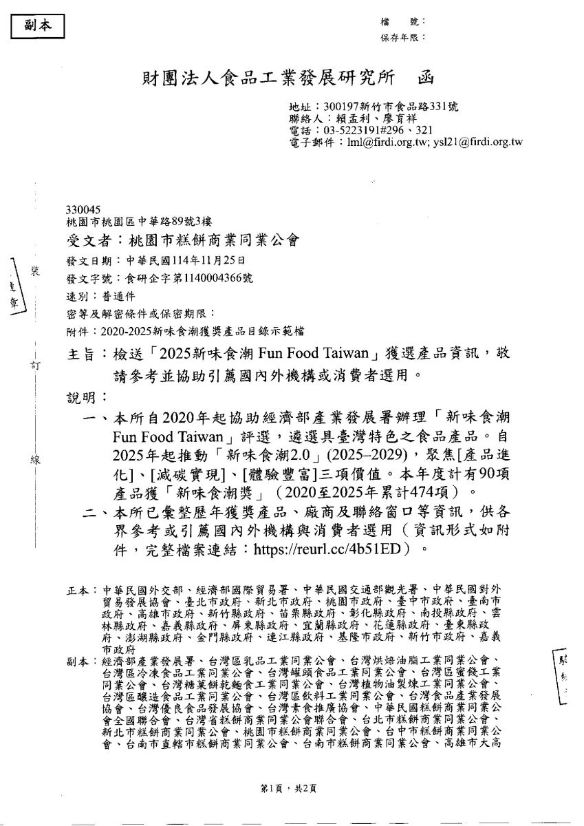 檢送「2025新味食潮 Fun Food Taiwan」獲選產品資訊,敬請參考引選用。