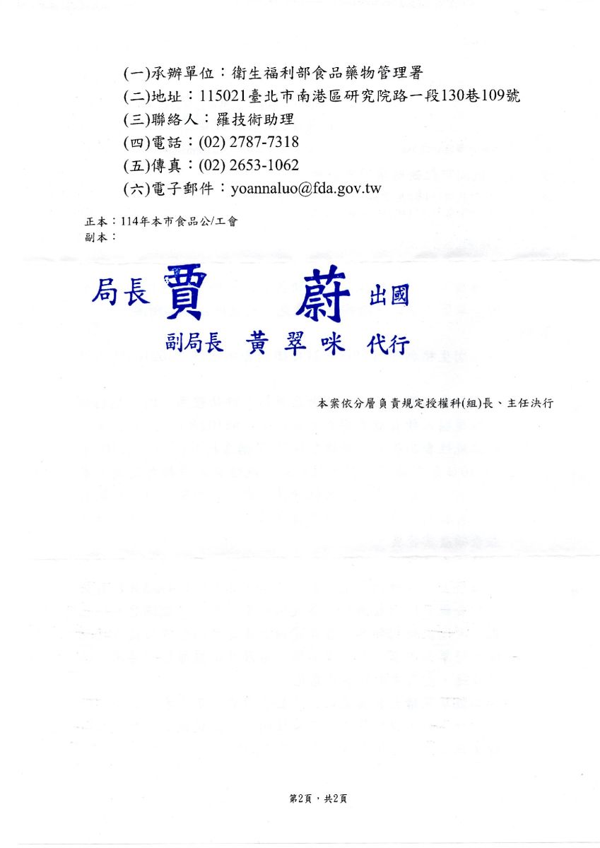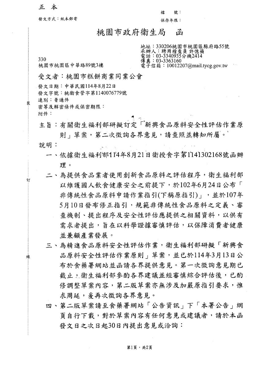有關衛生福利部研擬訂定「新興食品原料安全性評估作業原則」草案,第二次徵詢各界意見,請查照並轉知所屬。