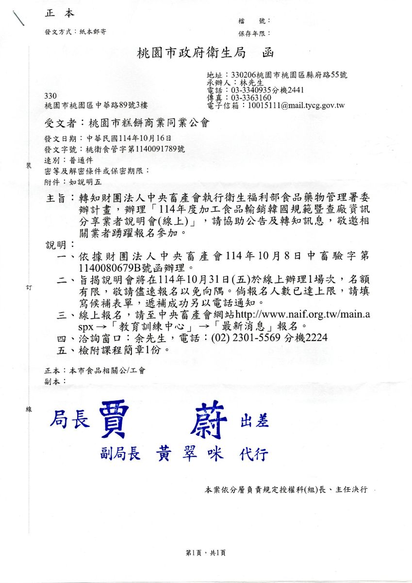 轉知財團法人中央畜產會委辦「114年度加工食品輸銷韓國規範暨查廠資訊分享業者說明會(線上)」,敬邀參加。