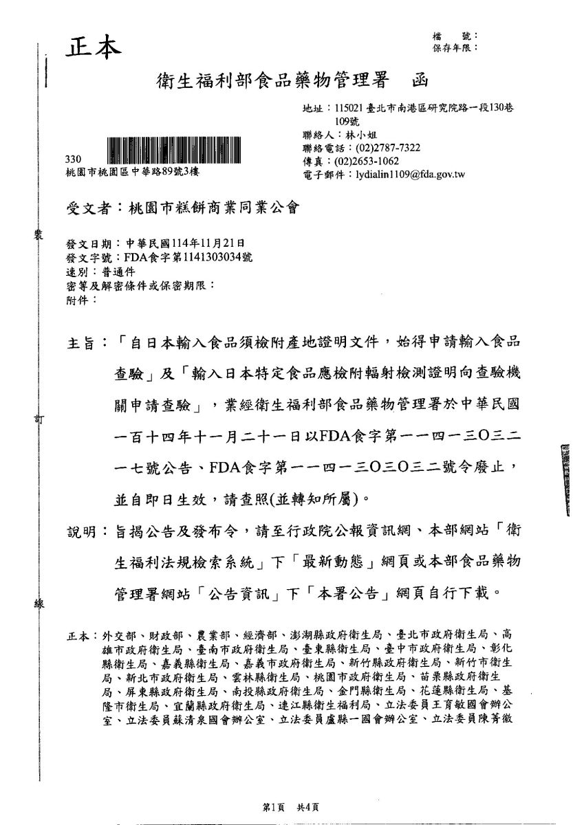 廢止「自日本輸入食品須檢附產地證明文件,始得申請輸入食品查驗」 及「輸入日本特定食品應檢附輻射檢測證明向查驗機關申請查驗」,並自即日生效。