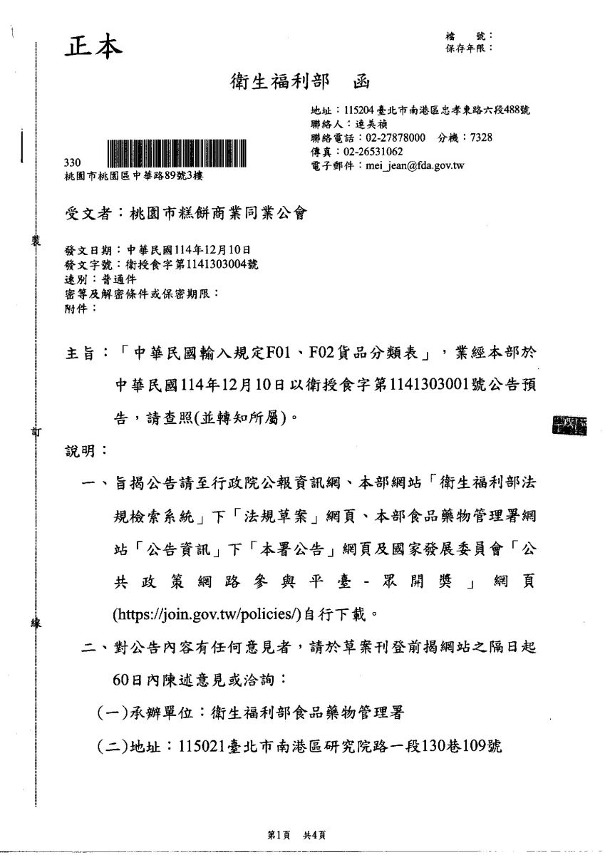 「中華民國輸入規定F01、F02貨品分類表」公告預告,請查照並轉知。