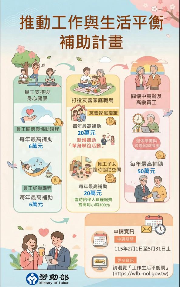 為鼓勵企業營造友善家庭職場,推動工作生活平衡措施,勞動部115年度「推動工作與生活平衡補助計畫」受理申請期限至5月31日止,歡迎企業把握時間踴躍提出申請。